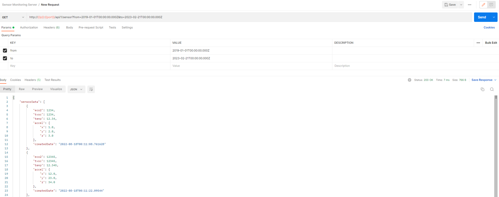 센서 데이터를 조금 더 업로드하고 Param에 DateTime 정보를 넣어 조회해봤다.