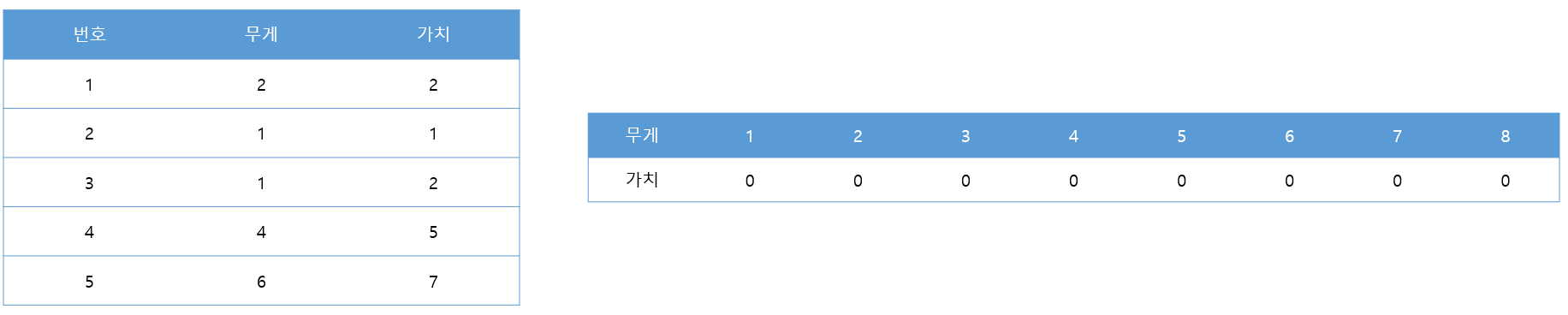 - 0이 아닌 값이 들어있다면, 배열[인덱스 + 물건의 무게]의 가치가 배열[인덱스] + 물건의 가치보다 작은지 확인한다.