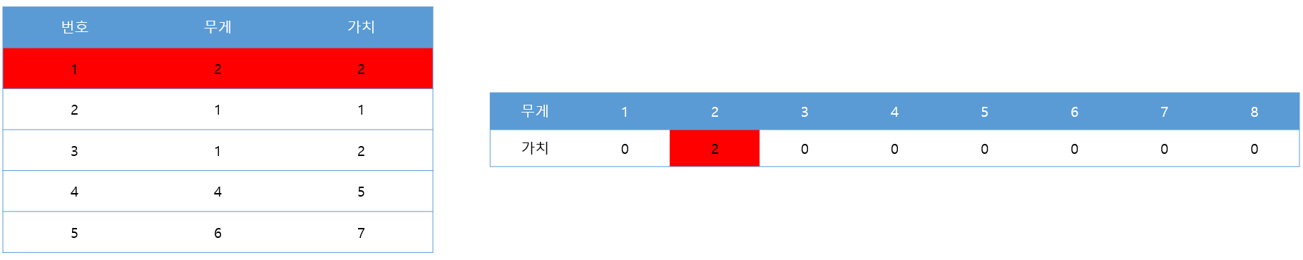 - 0이 아닌 값이 들어있다면, 배열[인덱스 + 물건의 무게]의 가치가 배열[인덱스] + 물건의 가치보다 작은지 확인한다.
