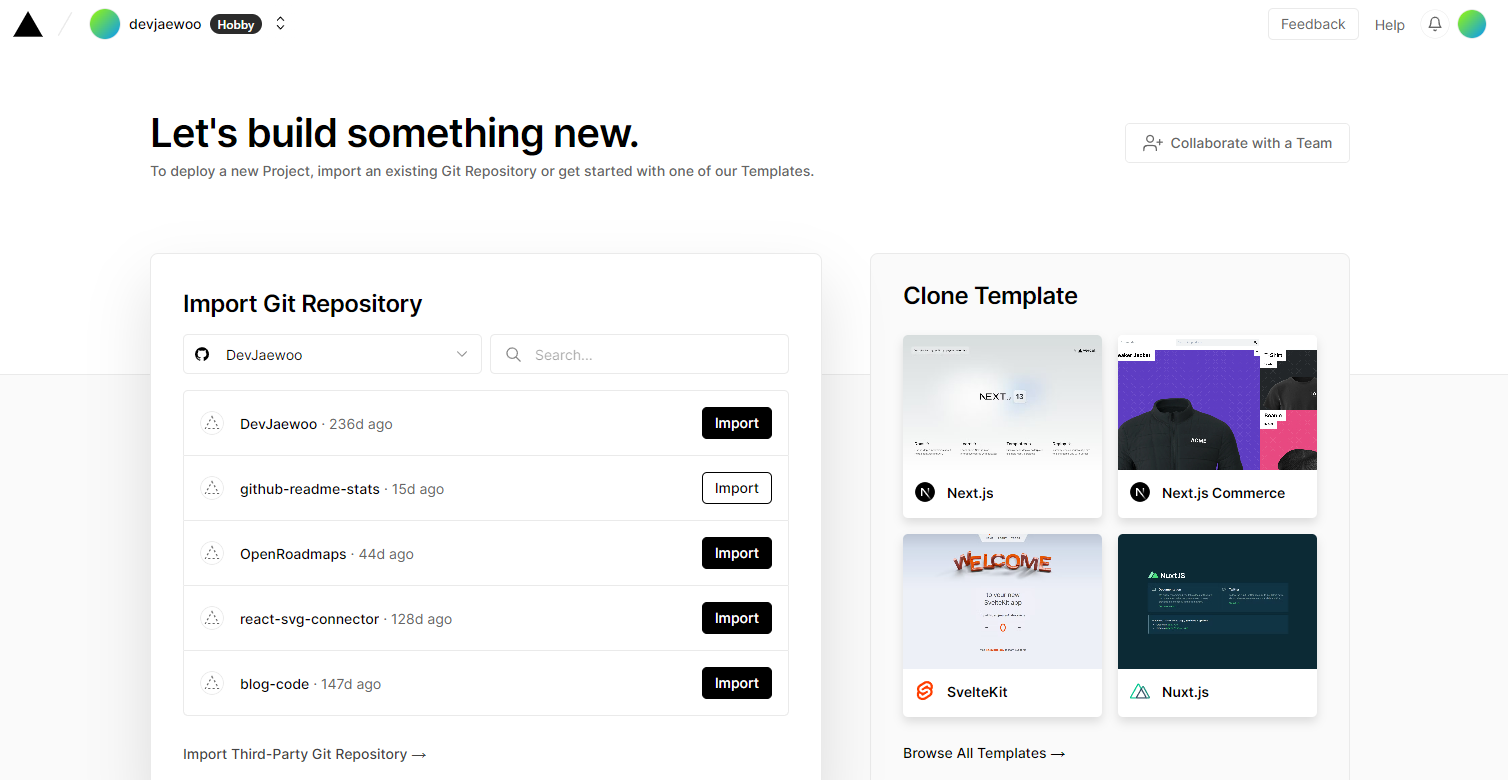 이제 Fork한 repo를 개인 Vercel에 배포해야 한다. 우선 Vercel에 Github로 hobby 계정을 만든 후 새 프로젝트를 생성한다. 아래 사진과는 달리 처음 생성된 계정의 경우 아무 프로젝트도 보이지 않는게 정상이다.